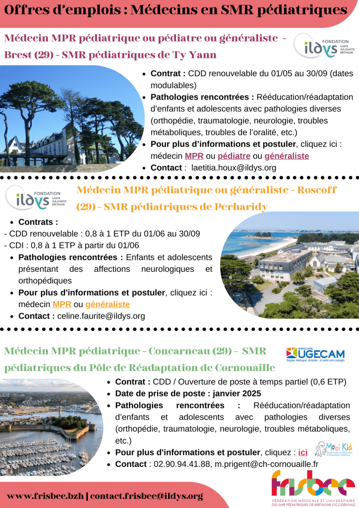 - 1 médecin MPR pédiatrique ou généraliste : 1 ETP – CDI ou CDD – à partir du 01/06 | SMR pédiatriques de Perharidy (Fondation ILDYS) à Roscoff (29). Infos ici : MPR ou généraliste